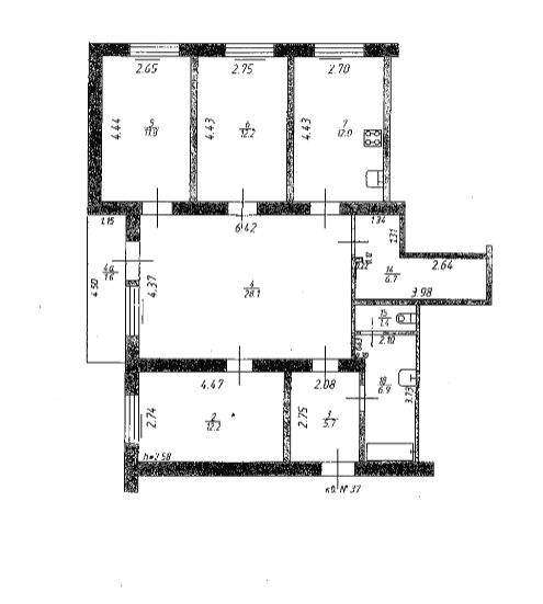 Жилая площадь 77.6 кв. м, кухня 9.7 кв. м, ремонта нет.