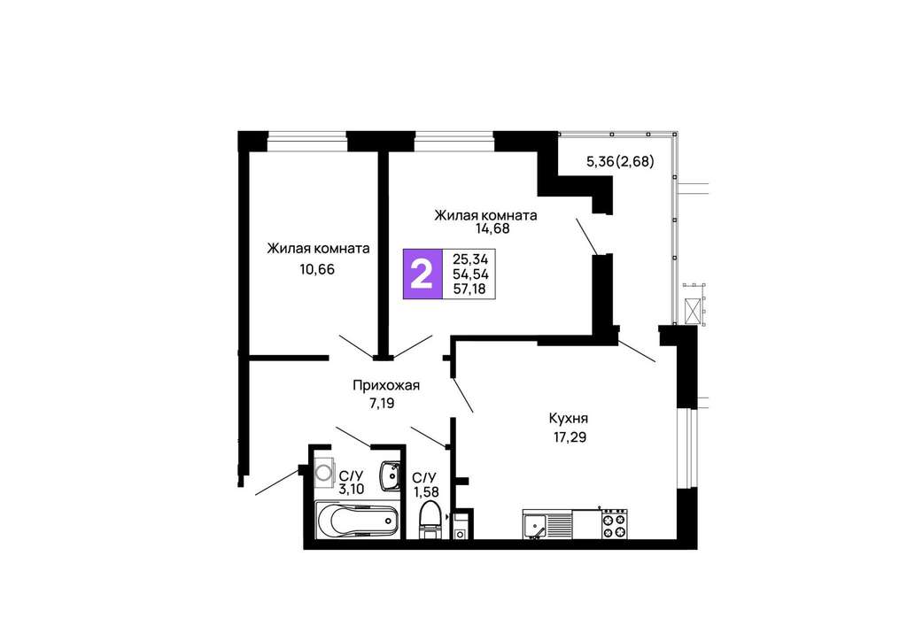 Жилая площадь 25.34 м2, кухня 17.29 м2, предчистовая отделка.