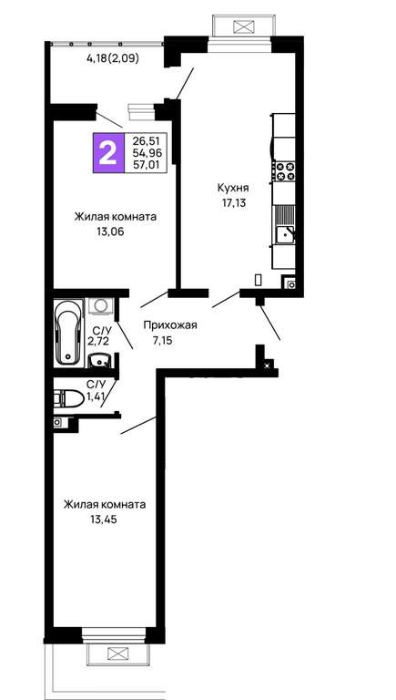 Жилая площадь 26.51 м2, кухня 17.13 м2, предчистовая отделка.