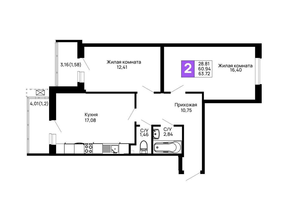 Жилая площадь 28.81 м2, кухня 17.08 м2, предчистовая отделка.