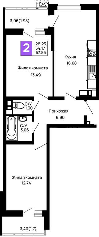 Жилая площадь 26.23 м2, кухня 16.68 м2, предчистовая отделка.