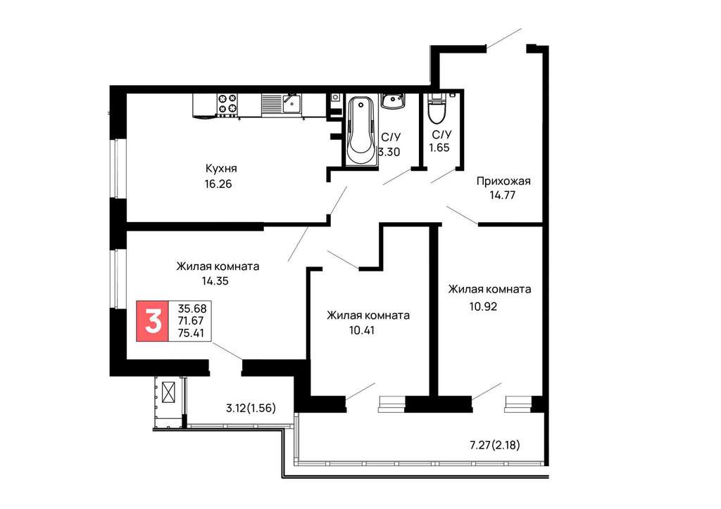 Жилая площадь 35.68 м2, кухня 16.26 м2, предчистовая отделка.