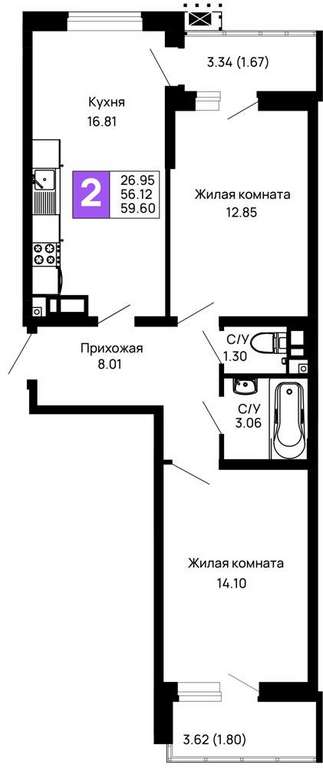 Жилая площадь 26.95 м2, кухня 16.81 м2, предчистовая отделка.