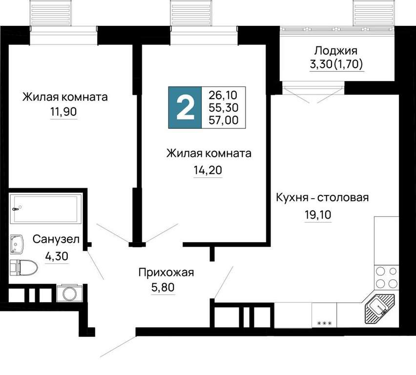 Жилая площадь 26.1 м2, кухня 19.1 м2, черновая отделка.