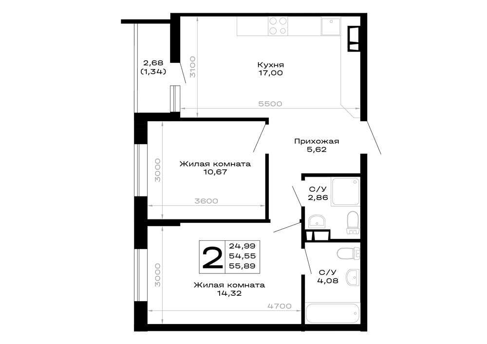 Жилая площадь 24.99 м2, кухня 17 м2, предчистовая отделка.