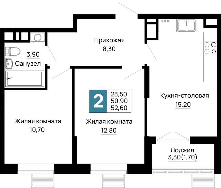 Жилая площадь 23.5 м2, кухня 15.2 м2, черновая отделка.
