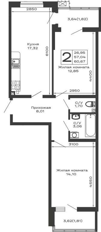 Жилая площадь 26.95 м2, кухня 17.32 м2, предчистовая отделка.