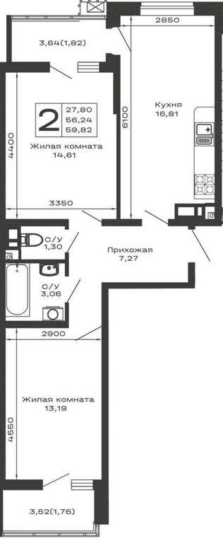Жилая площадь 27.8 м2, кухня 16.81 м2, предчистовая отделка.