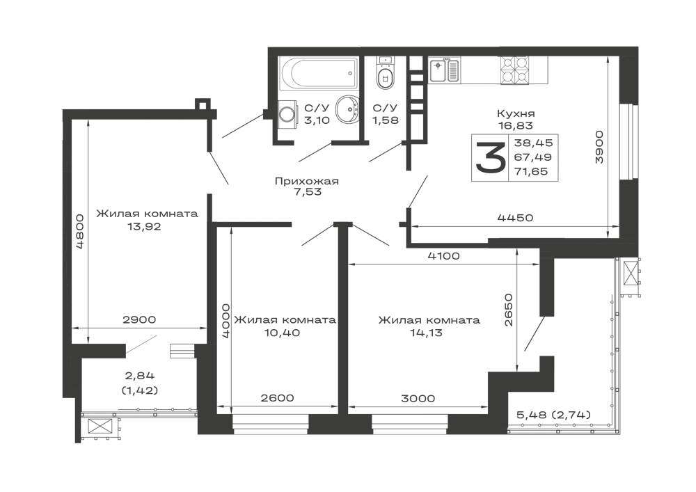 Жилая площадь 38.45 м2, кухня 16.83 м2, предчистовая отделка.