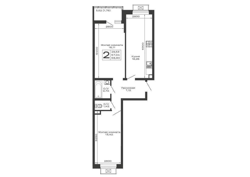 Жилая площадь 29.53 м2, кухня 16.25 м2, предчистовая отделка.